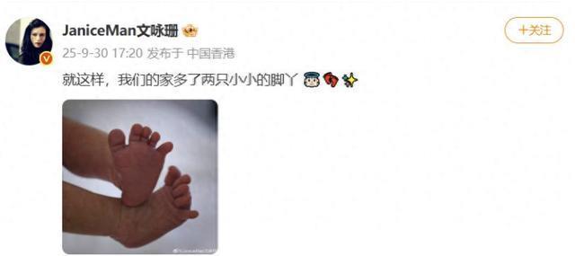 香港演员文咏珊在社交媒体发布了一张婴儿脚丫照片。